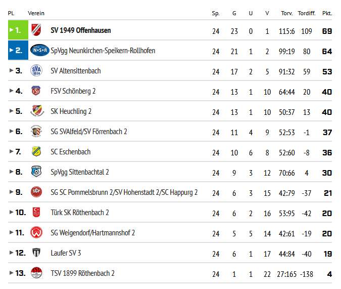 Tabelle: Im zweiten Anlauf der „hungrigen Jungen“ hat es geklappt. Der SVO ist Meister der A-Klasse geworden und feiert ein sehenswertes Torverhältnis von 115:6 Toren. Eine einzige Niederlage gegen den zweitplatzierten vorjahresabsteiger SpVgg NSR steht zu buche. Damit krönen die Trainer ihre Zeit beim SV Offenhausen mit einem Aufstieg. Kurz vor Ende der Saison unterstützte der höherklassig erfahrene Markus Näser mit einigen Toren freundschaftlich für Trainer Nico Weber. Der Zusammenhalt mit der 2. MS ist groß und bildet die Basis für den Aufstieg. Die bärenstarke Abwehr rund um Florian Scharrer lies nur wenige Gegentore zu. Nächste Saison gilt es sich weiter zu entwickeln und mit Wille und Zusammenhalt in schwierigen Spielen den Klassenerhalt zu erreichen.